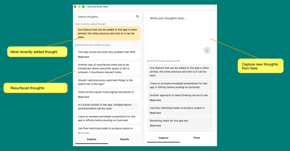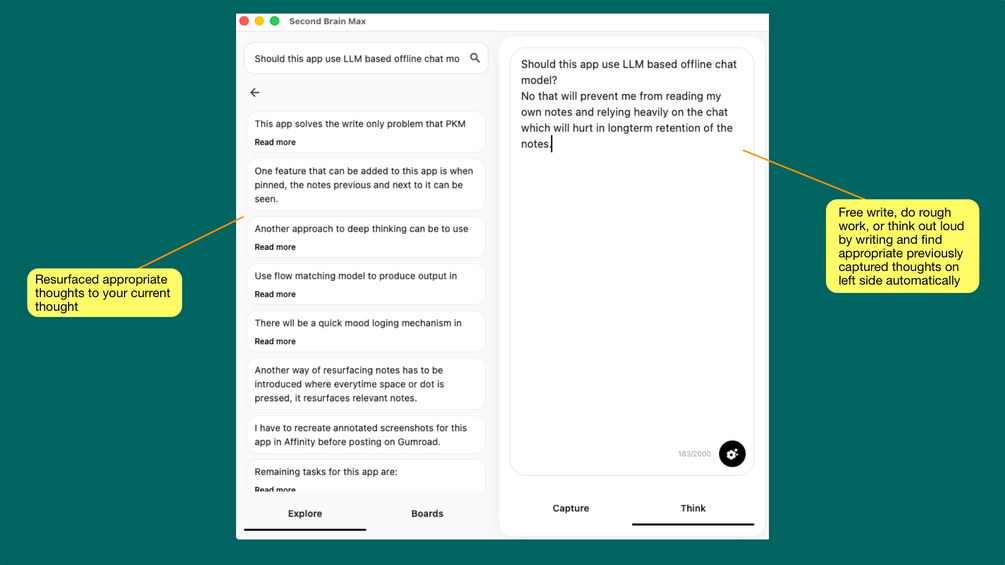 Hence I made this app. Zero setup app which comes with a powerful model that automatically resurfaces notes that I should be looking at right now based on what I am capturing or thinking. It also allows me to search notes using natural language so I can find them by meaning instead of keywords, which helps a lot in answering my questions based on what I have previously captured.